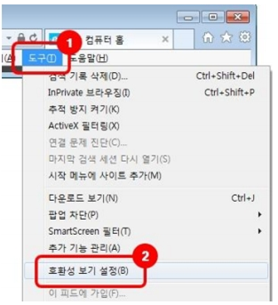 2. Internet Explorer 메뉴모음 > 도구 > 호환성 보기 설정을 클릭